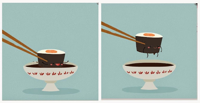 No sushi, os olhos também comem pela cor e pela forma e dá pena asfixiar com os pauzinhos um hozomaki tão bem elaborado, afogá-lo no molho de soja e apimentá-lo com wasabi.